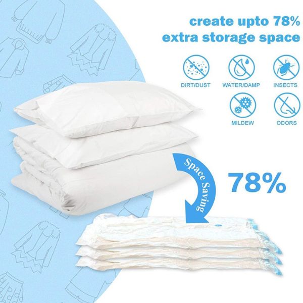 È possibile risparmiare fino all’80% dello spazio utilizzando i sacchetti sottovuoto, ideali per tutte le esigenze di conservazione. Dopo la chiusura, possono essere facilmente riposti sotto il letto, sullo scaffale o sotto l’armadio.