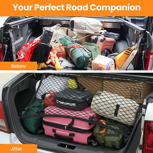 NETLASTIK mantiene borse, spesa, attrezzatura sportiva, bagagli o oggetti sciolti saldamente al loro posto durante qualsiasi guida. Niente più carico che si sposta, bottiglie che rotolano o disordine improvviso: solo un trasporto sicuro e stabile all’interno del bagagliaio di qualsiasi auto standard.