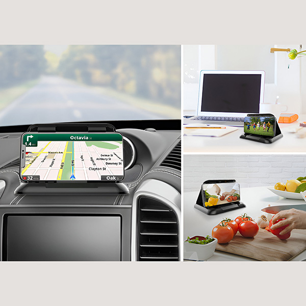 La staffa inclinabile a 120° consente di ottenere il miglior angolo di visione e di vedere chiaramente lo schermo del telefono per una guida sicura. Quando non viene utilizzato, si ripiega e trova facilmente posto nella console centrale, nel vano portaoggetti o nella tasca della portiera.