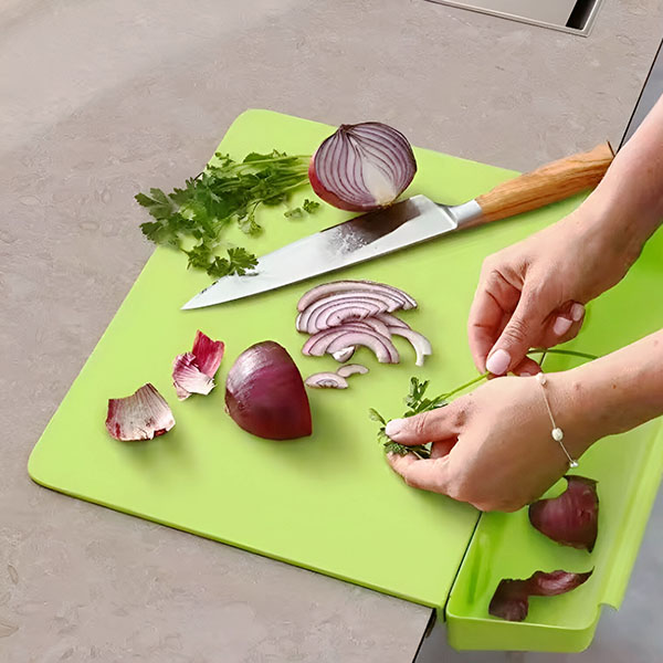 Un tagliere con un contenitore dedicato ai rifiuti organici. Una soluzione pratica per un piano di lavoro in cucina sempre ordinato.